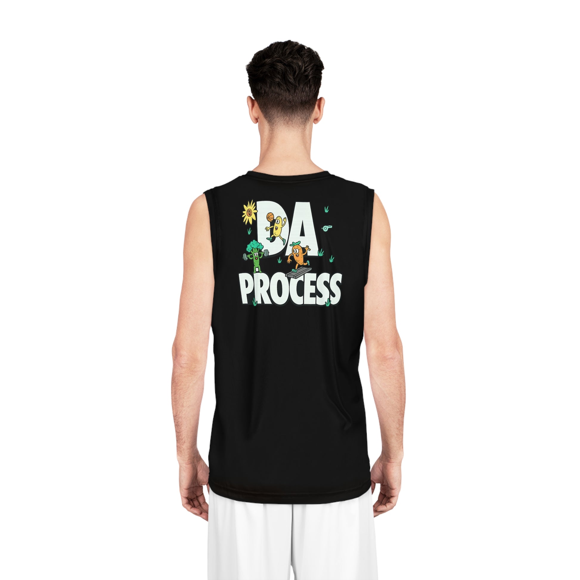 Lightweight and breathable, this basketball jersey moves with you — from pick-up games to hot summer practices. The black all-over panel keeps the look clean and minimal, while the back features a playful “DA PROCESS” graphic with small characters and nature accents that add personality without shouting. The extra-light, moisture-wicking polyester pulls sweat away fast and resists odor, so you stay focused and comfortable through full-court sprints and after-game hangouts. Reinforced double-needle seams and side seams give the silhouette reliable shape and durability, wash after wash. Whether you wear it for training, team drills, or casual street looks, it reads sporty and intentional — a subtle nod to the grind and the small moments that make progress.